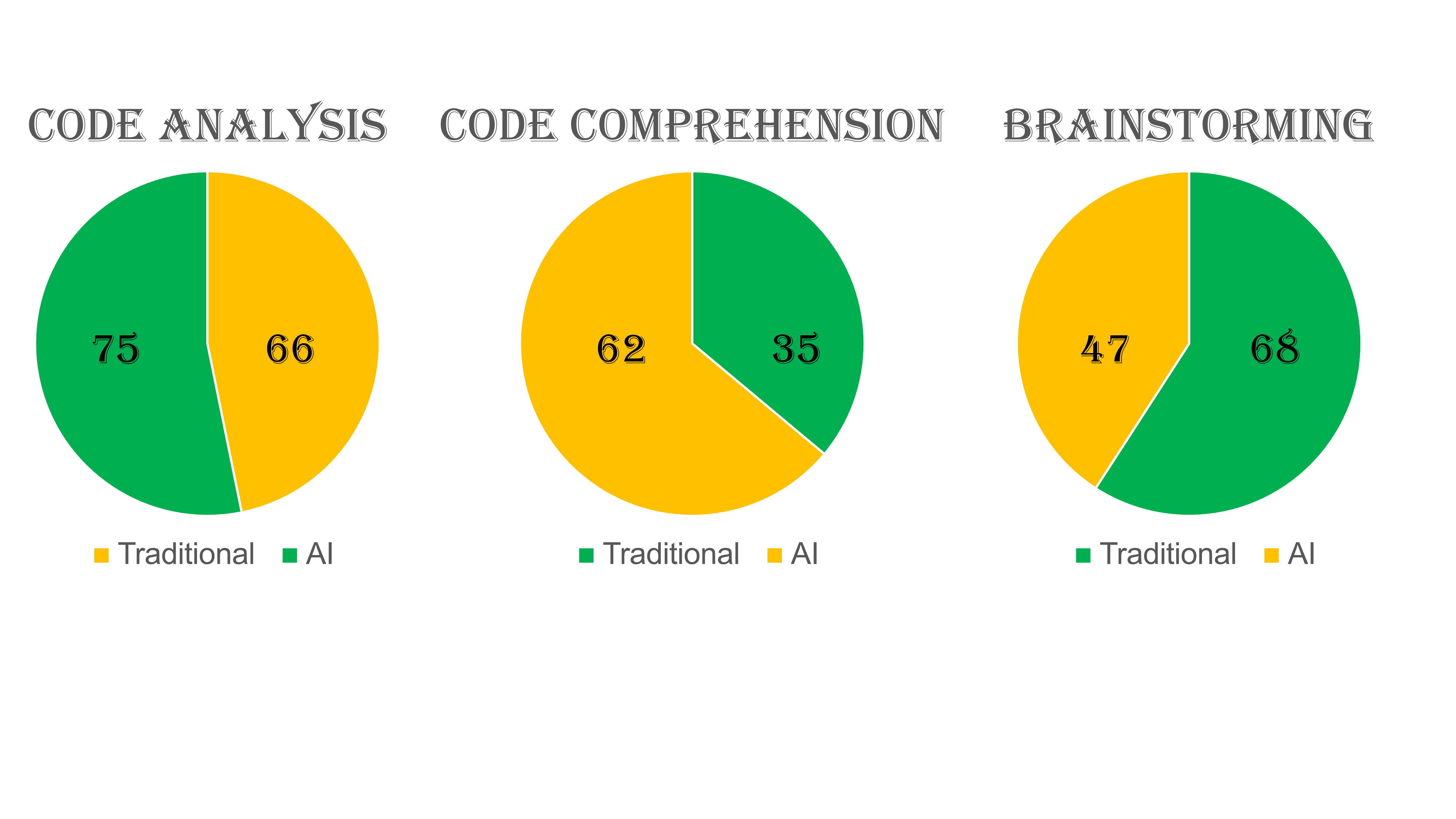 There can be an overuse element of AI, one instance of overuse by a participant, “…if you keep looking at ChatGPT for more and more alternate solutions, it just makes you lose your confidence.” That statement resonates with myself and the computer science classroom nowadays for sure, since there is a difference between truly knowing something or simply looking at AI such as ChatGPT with no true knowledge of the concept. As mentioned by some participants, “AI tools are not suited for supporting their learning, despite their ability to provide personalized responses, as they often provide inadequate levels of detail.” With the notion of “…just throw the error, or whatever problem,…to ChatGPT and it will fix it” is an instance of downgraded critical thinking and learning as opposed to being critical of the responses that AI has outputted and taking that with a grain of salt. Now, a few participants in the survey had said, “…when I’m done I approach GPT for practice… I’ll ask GPT to give me [practice] problems… I would start thinking of [how to solve] them. And then I would asks it again to give me the solution when I’m done [figuring out] my own so that I can compare and think…” I strive to take this approach and most of the time I do and will compare what my AI had responded with to the Internet itself. This paints a picture that using AI isn’t bad in itself, it simply has to be fostered in control and not hinder critical thinking and learning of the human mind versus an algorithm.